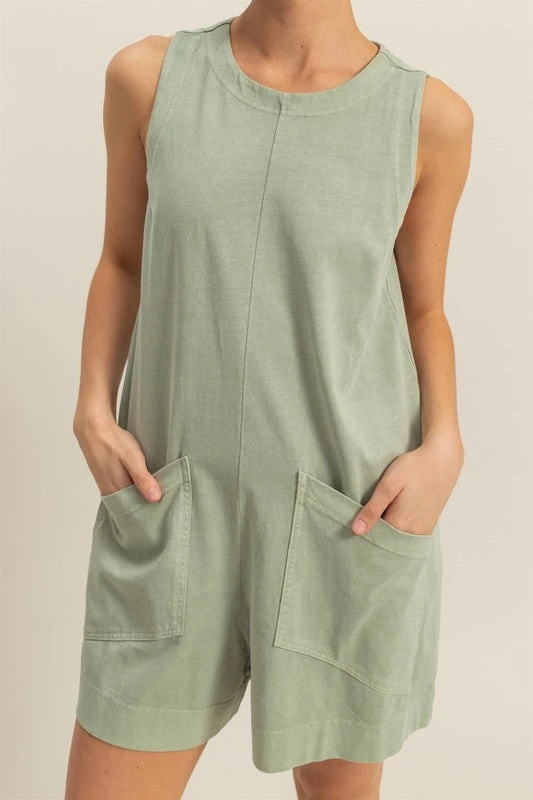This Adorable Romper features a round neckline and convenient front pockets, making it both stylish and practical. The sleeveless design adds to its comfort and versatility, making it the perfect addition to your wardrobe. Expertly crafted with your needs in mind, this romper is a must-have for any fashion-forward individual.