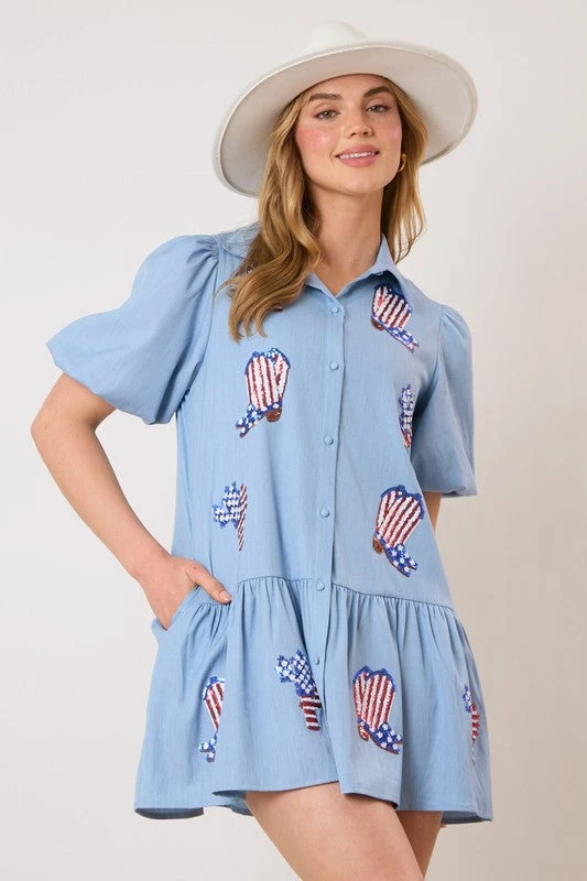 Step into style with our Boots & Cactus Dress. Featuring intricate cactus and boot sequin designs paired with a collared, button down front, and puffed sleeves, this dress is a unique and chic addition to your wardrobe. Perfect for standing out in any occasion.
