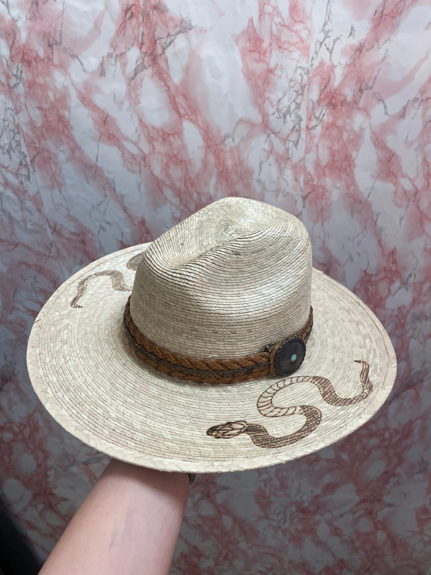 Protect yourself from the sun in style with the Cassidy Palm Hat! This elegant hat features a braided brown leather hatband with a unique concho detail, adding a touch of sophistication. Plus, the snake design burned on the brim adds a subtle yet eye-catching detail. Perfect for any outdoor occasion.