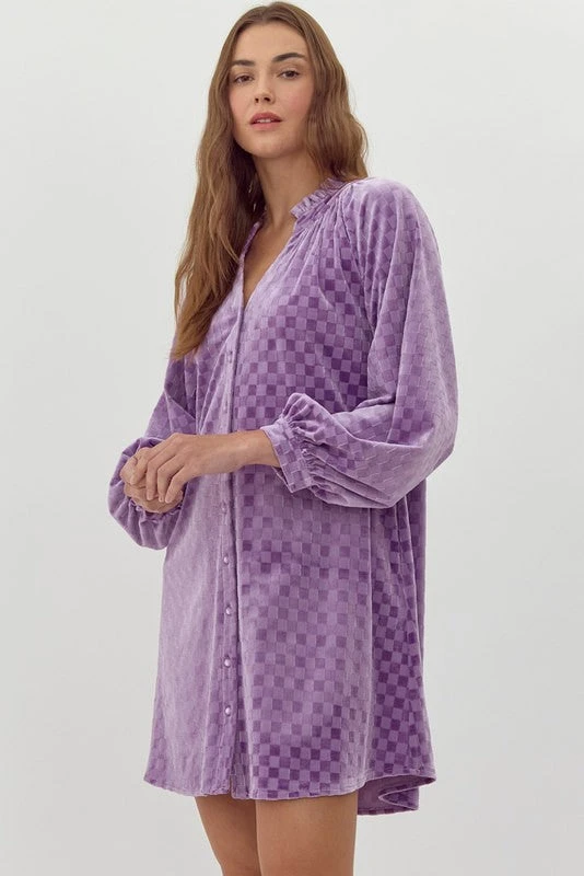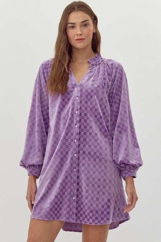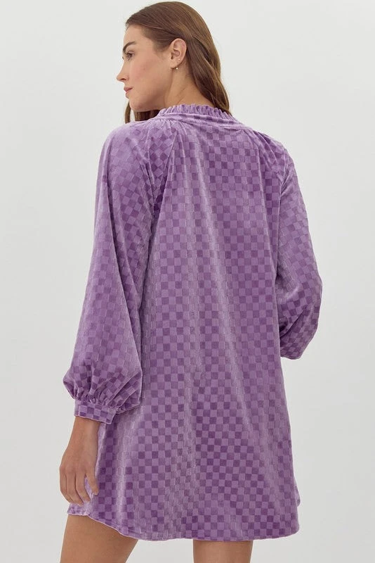 This Checkered Velvet Mini Dress features long sleeves and a frilled neck, providing a chic and sophisticated look. The side pockets add convenience and functionality. Crafted with high-quality velvet, this dress offers comfort and style that will make a statement at any occasion.