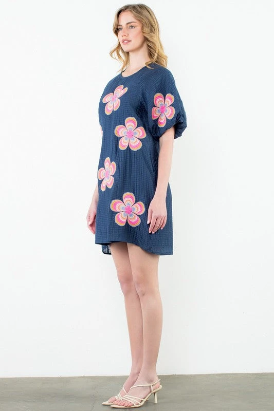 This Colorful Flowers Dress boasts puff sleeves and a relaxed fit for a comfortable and fashionable look. Its eye-catching flower patches add a touch of whimsy and charm. Expertly crafted with a blend of style and comfort, this dress is perfect for any occasion.