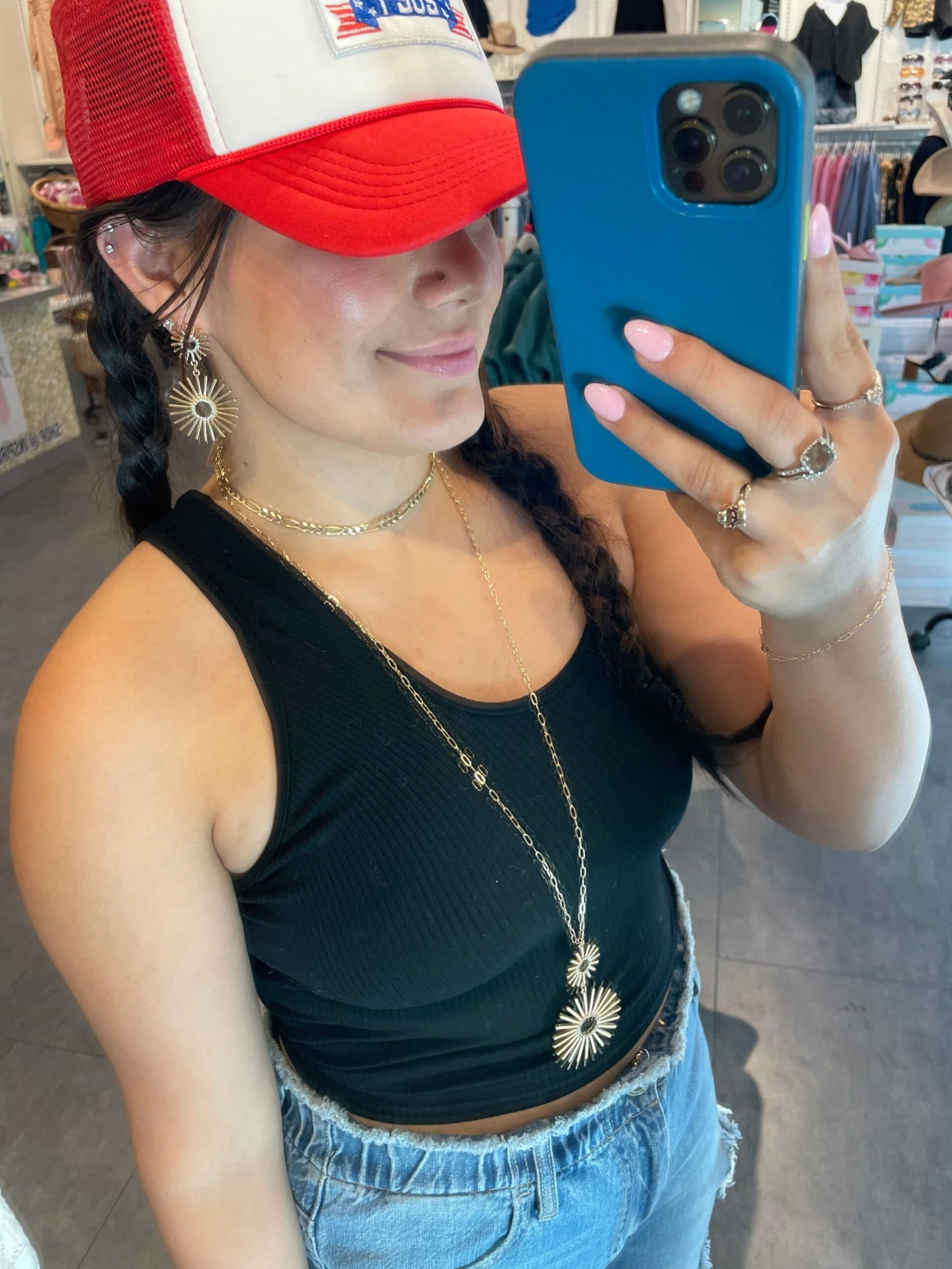 Add a touch of elegance to your ensemble with these timeless Double Sunburst Drop Earrings. The delicate sunburst pendants are detailed with rhinestones in the center, making them the perfect accessory for special occasions. Crafted with superior quality materials, these earrings are designed to withstand the test of time.