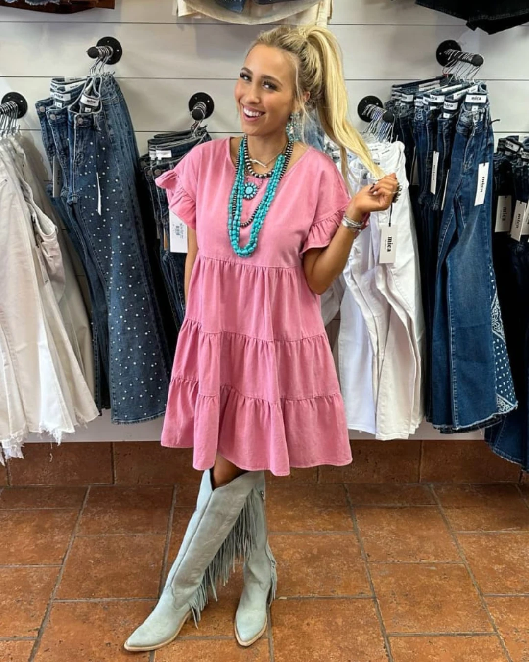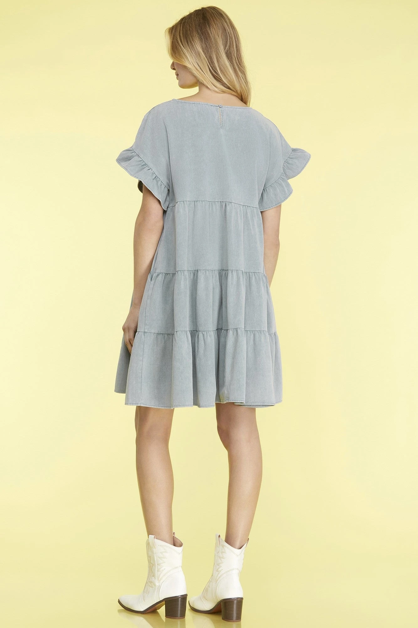 Be the trendsetter in this unique Drop Shoulder Ruffle Tiered Dress. The playful ruffled sleeves and tiered design add a touch of fun to this dress, while the wash woven material and side pockets offer comfort and convenience. Stay stylish and comfortable with this must-have dress!