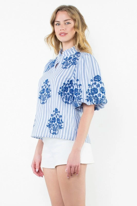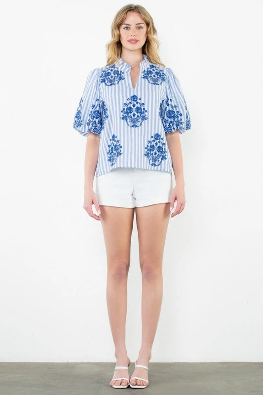 This Embroidered Stripe Top features 3/4 puff sleeves and an embroidered floral pattern on a striped base, providing a unique and elegant look. Made with high-quality materials, this top is both comfortable and stylish, making it the perfect addition to any wardrobe. Elevate your wardrobe with this expertly crafted top.