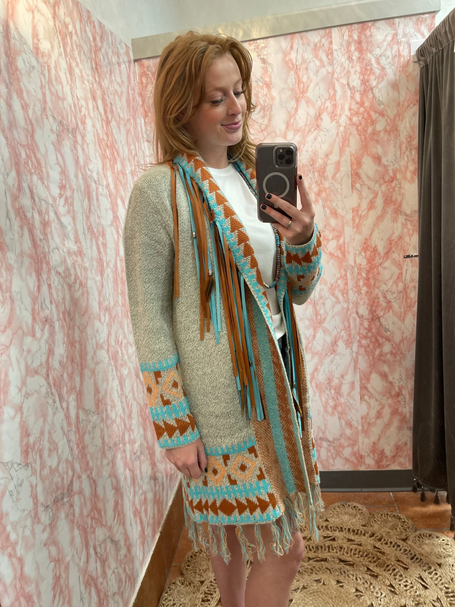 Expertly crafted with a beautiful southwestern print and detailed with a fringe hemline, our Feathered & Fringed Coat adds a touch of western charm to any outfit. The suede fringe and feather accents elevate this coat to a statement piece, perfect for any fashion-forward individual.