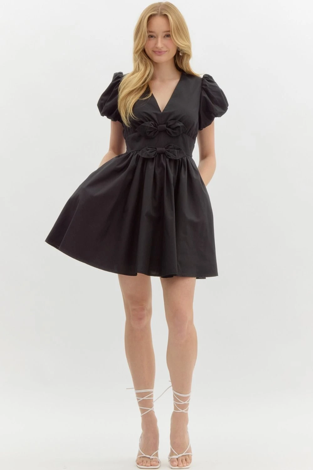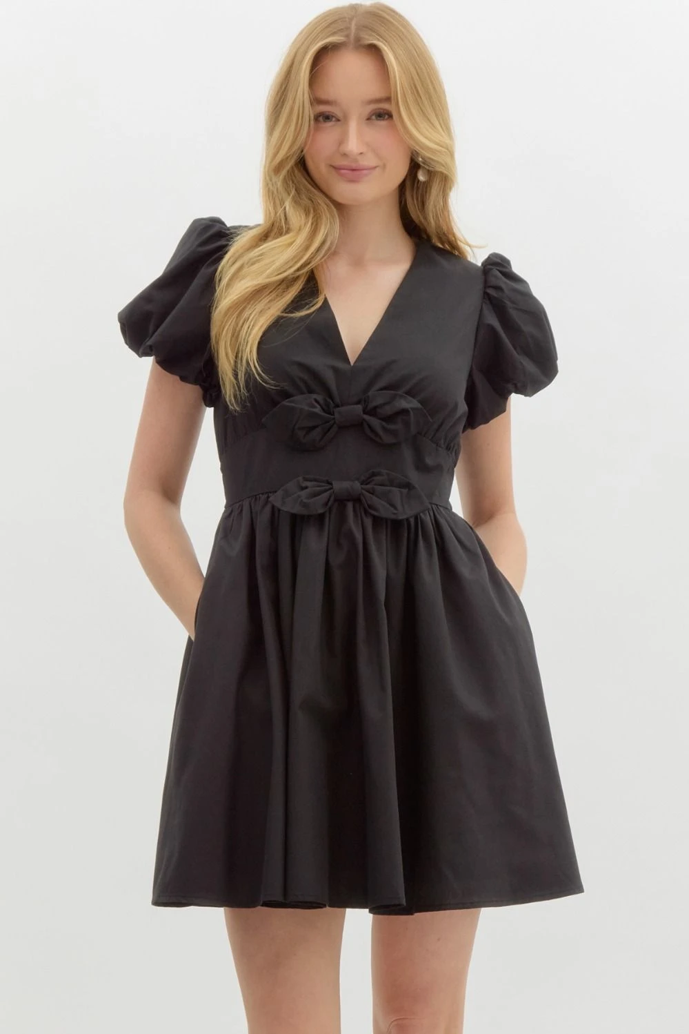 Discover the perfect combination of elegance and playfulness with our Fit and Flare Bow Dress. Featuring oversized bows on the front and short bubble sleeves, this mini dress is the ultimate way to make a statement. The flattering fit and flare waist and smocked elastic back ensure a comfortable and stylish fit.