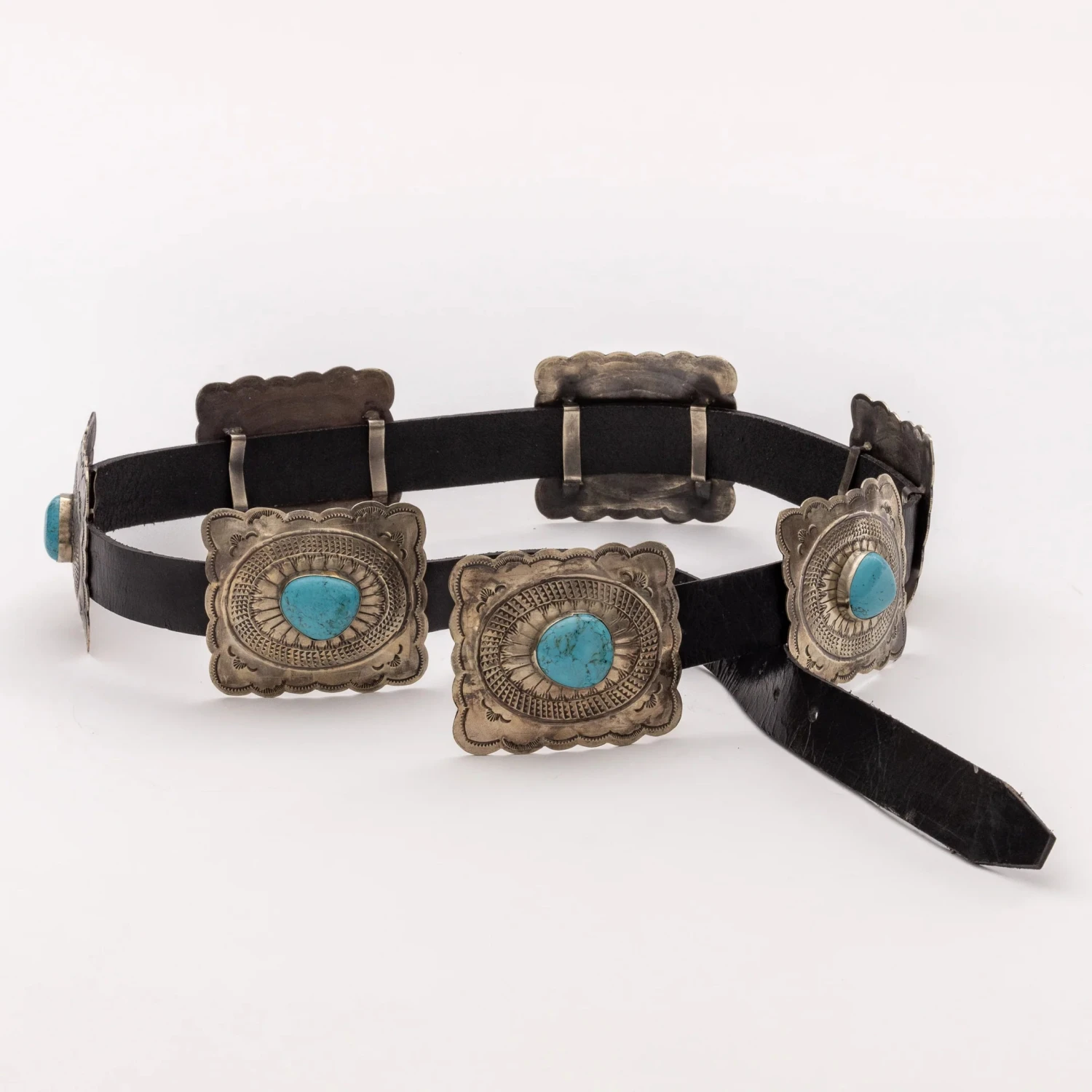 Expertly handcrafted with rustic silver and genuine leather, our Fluted Concho Belt adds a southwestern touch to any outfit. Featuring stunning turquoise center stones, this belt is the perfect blend of style and craftsmanship. Elevate your look with this unique and timeless accessory.