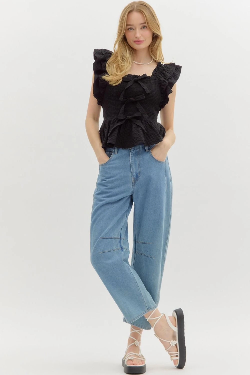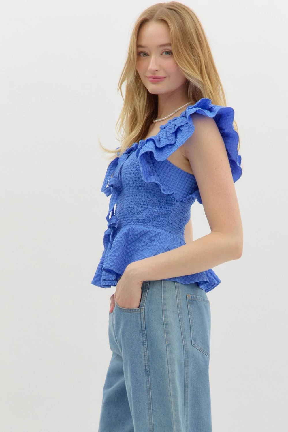 Make a statement in this playful Flutter Sleeve Bow Top! Made from textured material, it features charming flutter sleeves and a smocked design with a sweet bow detail. Perfect for adding a touch of fun to any outfit!