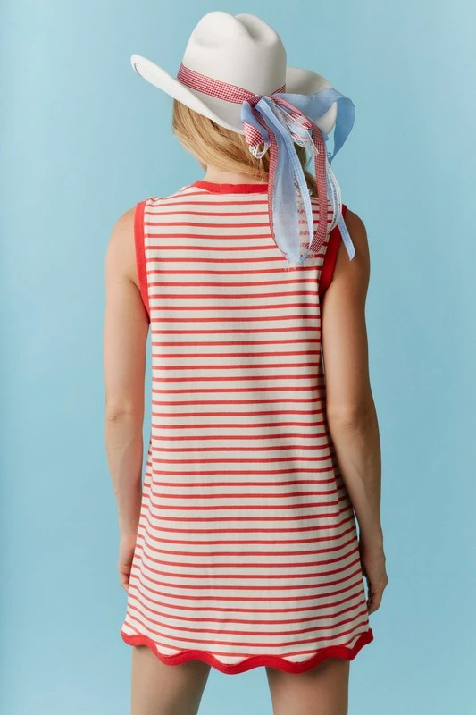 Get ready to make a statement in this Lace Bow Stripe Mini Dress! With a scalloped bottom hem and a sleeveless design, this dress is both stylish and comfortable. Perfect for any occasion, it’s the ultimate choice for a fun, quirky look.