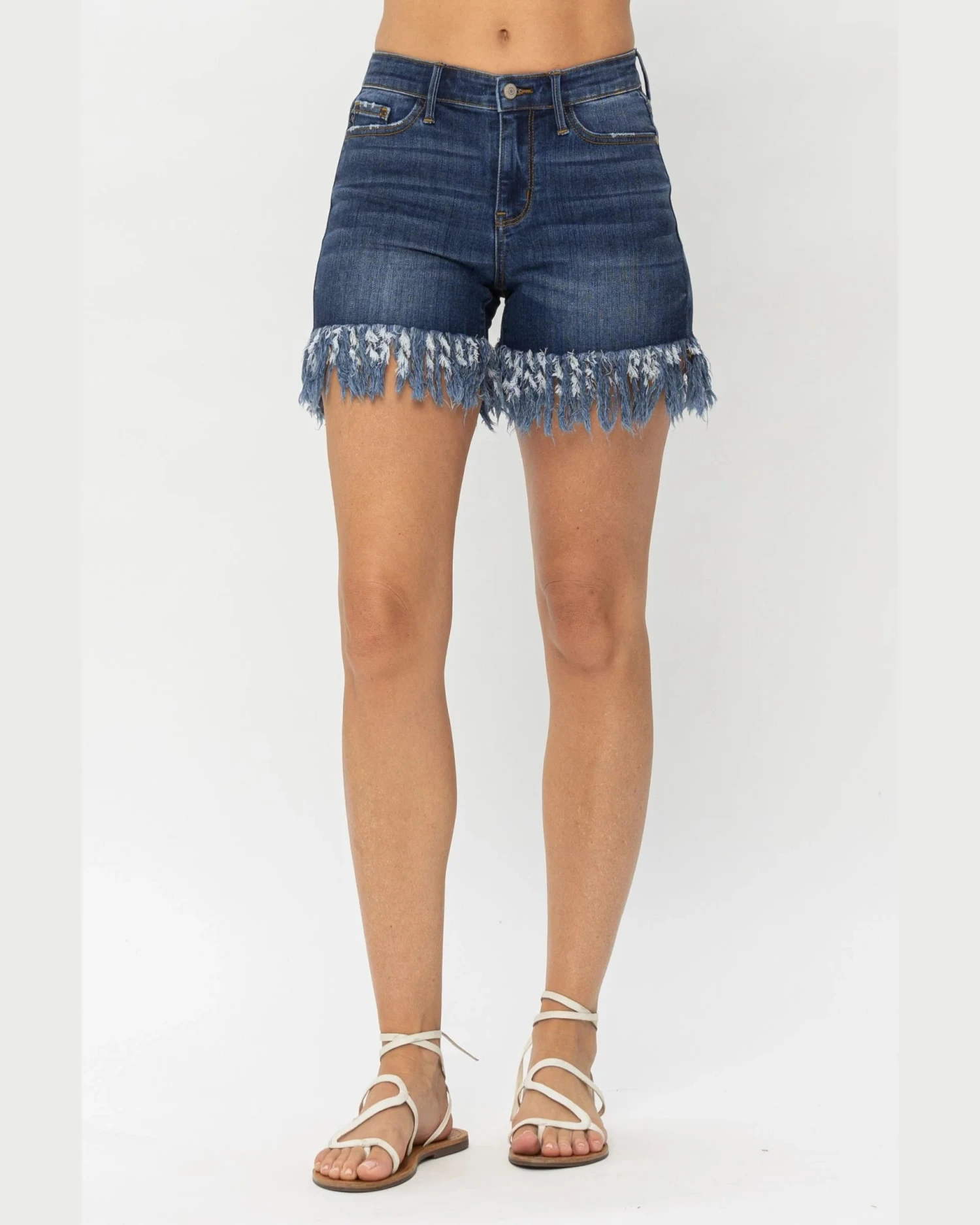 Need a little extra fray to cover the tush? Then Judy Blue’s Long Fray Hem Short is the perfect short for you! A mid rise medium wash short that has just longer fray hemline.