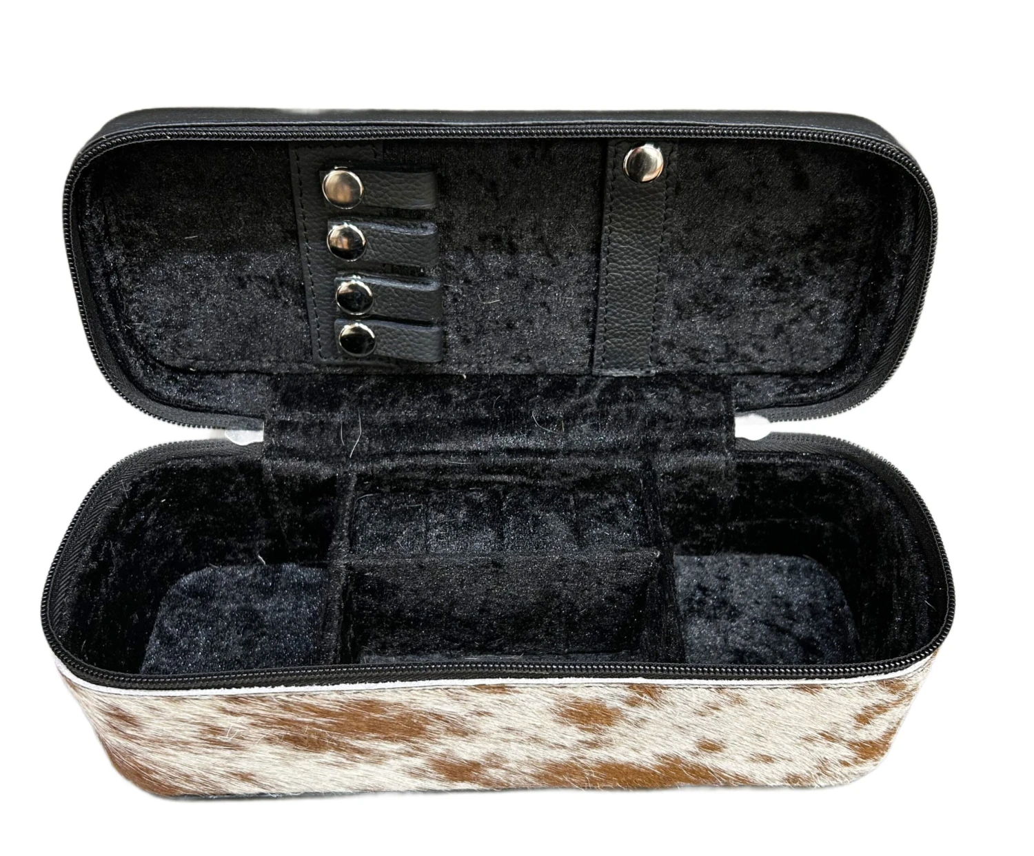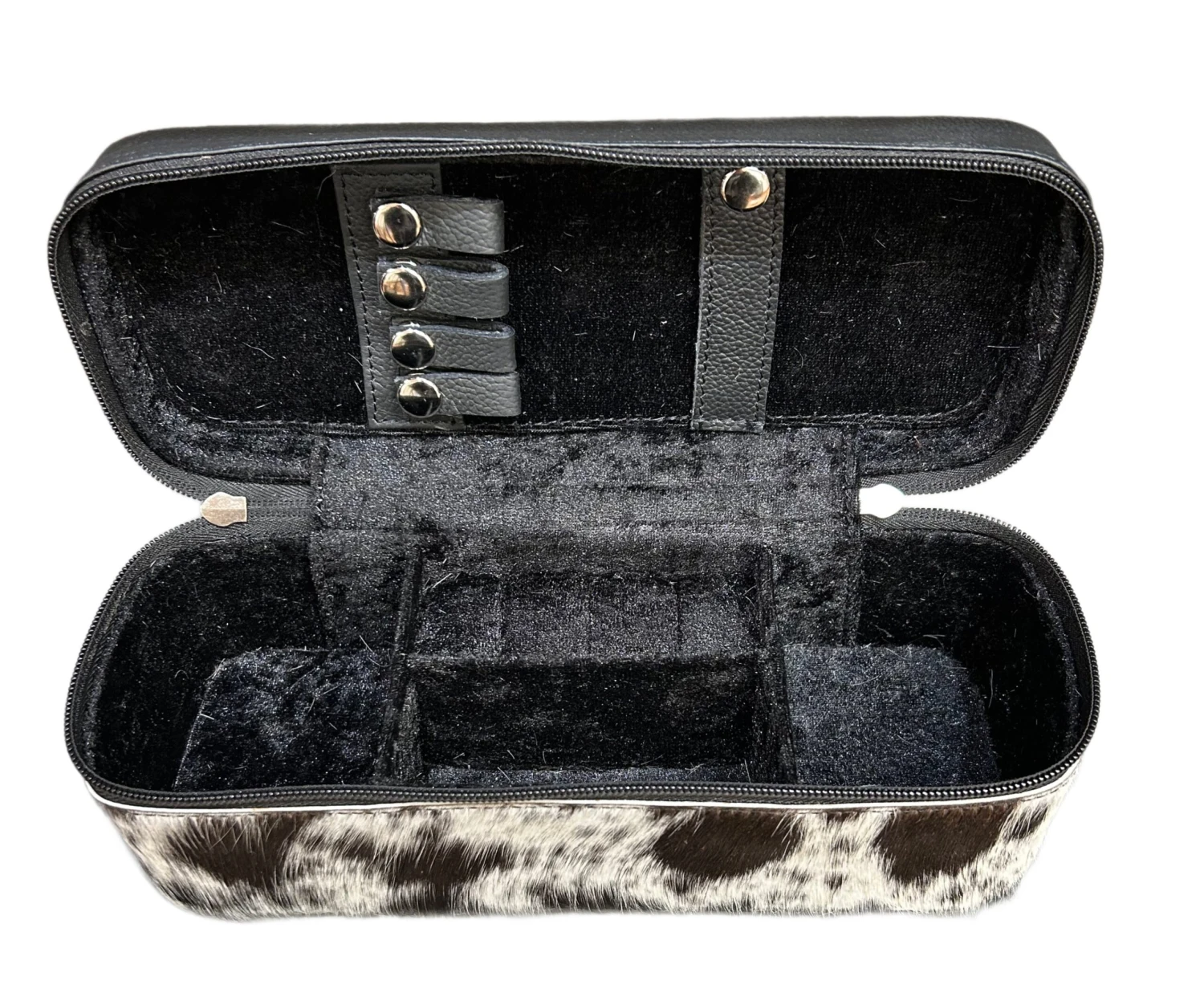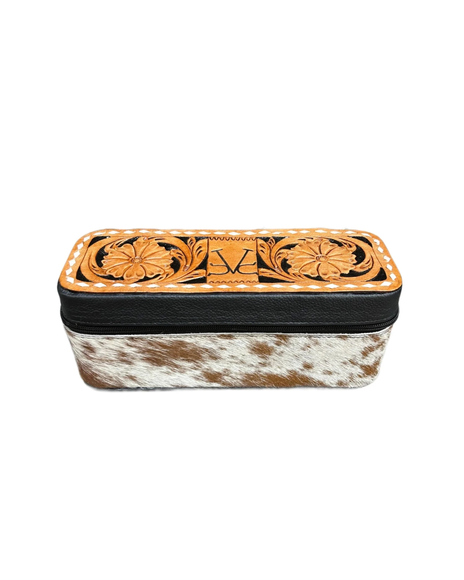 Keep your jewelry nice and safe with the Mini Plus Travel Jewelry Case with floral tooled leather and white bucksitich lacing top, with hair on hide, black leather or dark chocolate brown leather with black velvet interior. This has 2 compartments along with ring holder and 4 leather straps on lid, perfect to throw in your bag.