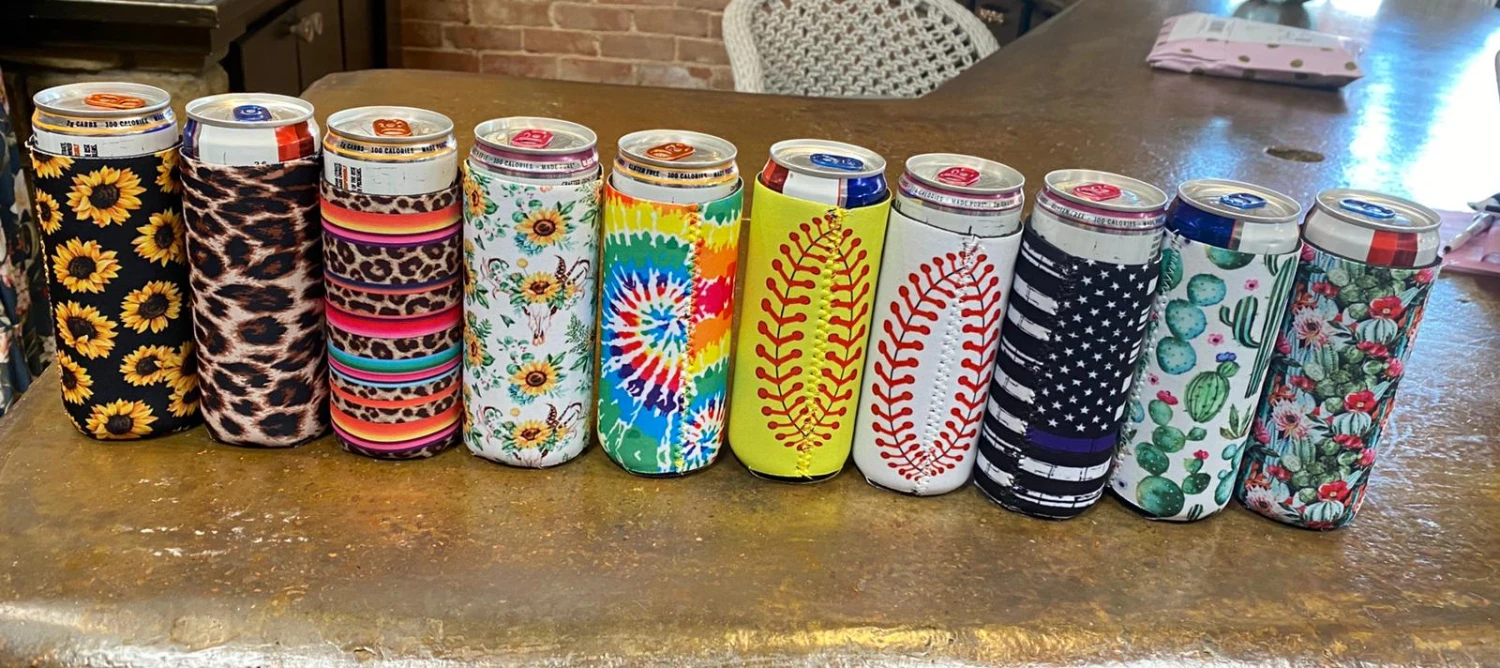 Slim koozies are great to keep your drinks cool while you’re out on the lake or by the pool. They come in several prints, baseball, leopard, tie-dye, sunflower, cactus and serape & leopard.