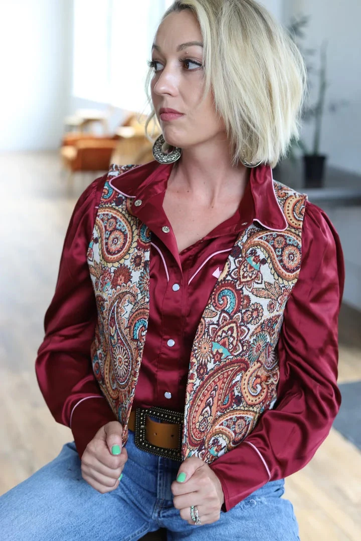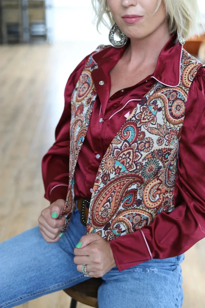 This elegant Paisley Weaved Vest adds a touch of sophistication to any western outfit. Its intricate woven design showcases your sense of style, while providing comfortable wear. Perfect for formal occasions or a night out on the town. Expertly crafted for your enjoyment.