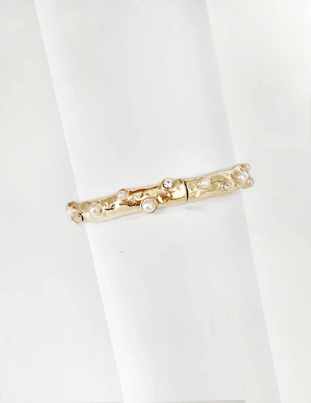 Enhance your style with our elegant Pearl Rhinestone Gold Bracelet. The stretch bracelet features a classic worn gold design with delicate pearl and sparkling rhinestone accents. Elevate any outfit with this timeless piece.