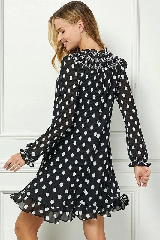 This Polka Dot dress features a smocking neckline, ruffled hemline and plisse fabric, creating an effortlessly elegant silhouette. The playful polka dots add a touch of whimsy to any outfit. Enjoy the comfort and style of this dress for any occasion.