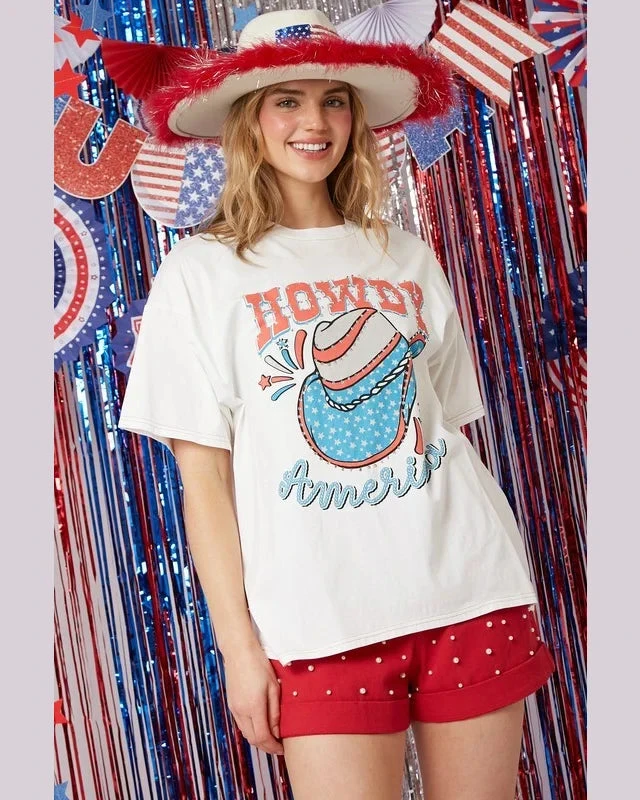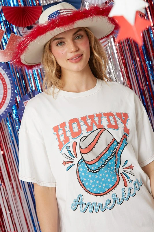 Get ready to show off your patriotic side with our Rhinestoned Howdy T-Shirt! Made with 100% cotton, this t-shirt is perfect for those summer time celebrations. The Americana and Country design, along with the rhinestone detailing, will have you saying “Howdy” in style. (Yeehaw!)