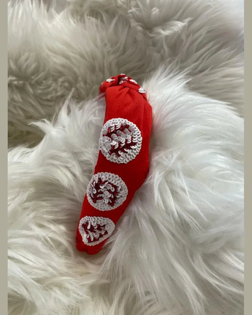 Add a touch of sparkle to your baseball game look with our Sequin Baseball Headband. The red knotted headband features sequin baseballs all over, perfect for showing your team support or love of the game.