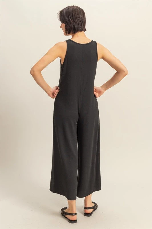 This Sleeveless V Jumpsuit features a plunging neckline that accentuates the neckline for a bold and stylish look. The sleeveless design provides comfortable wear, while the flowy pants add a touch of elegance and movement to your outfit. Elevate your style with this versatile and chic jumpsuit.
