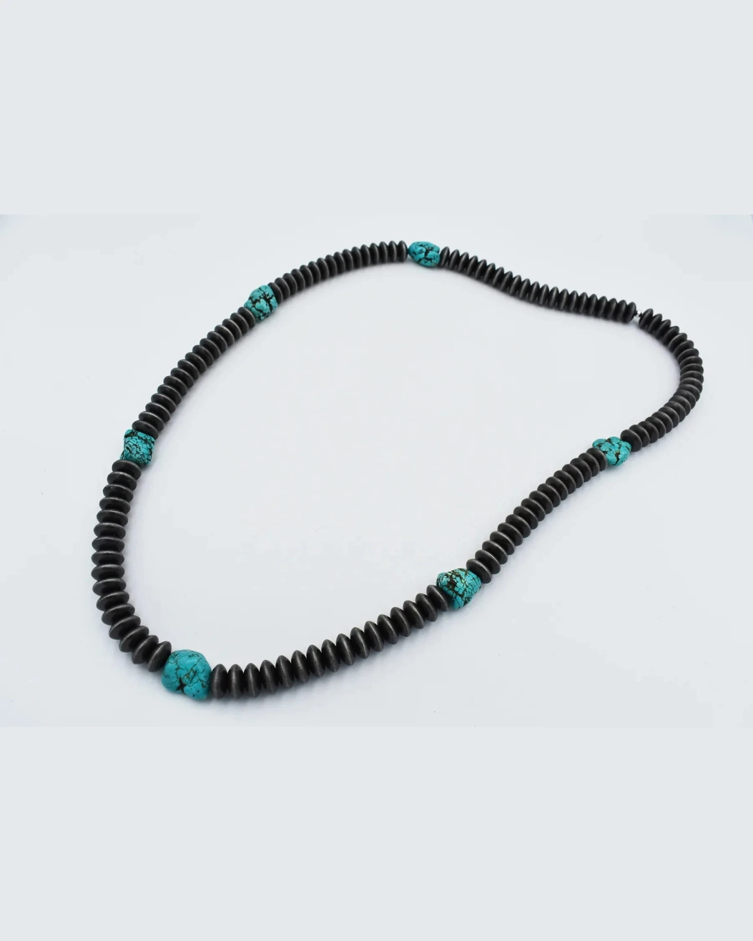 This Turquoise and Silver Disc Necklace features beautiful turquoise nuggets and silver pearl disc shaped beads. The combination of these materials creates a unique, eye-catching look that is sure to make a statement. The high-quality craftsmanship and elegant design make it the perfect addition to any jewelry collection.